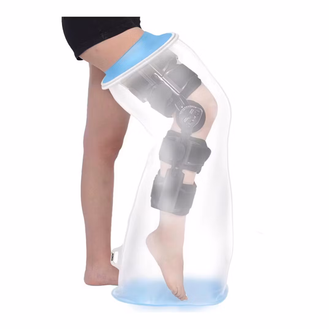 Detta duschskydd för hela benet håller gips, bandage och sår helt torra under duschen – samtidigt som den halkfria sulan ger ett tryggare fotfäste på våta badrumsgolv. Den mjuka silikonringen sluter tätt utan behov av tejp eller remmar, och materialet är både hudvänligt och återanvändbart.