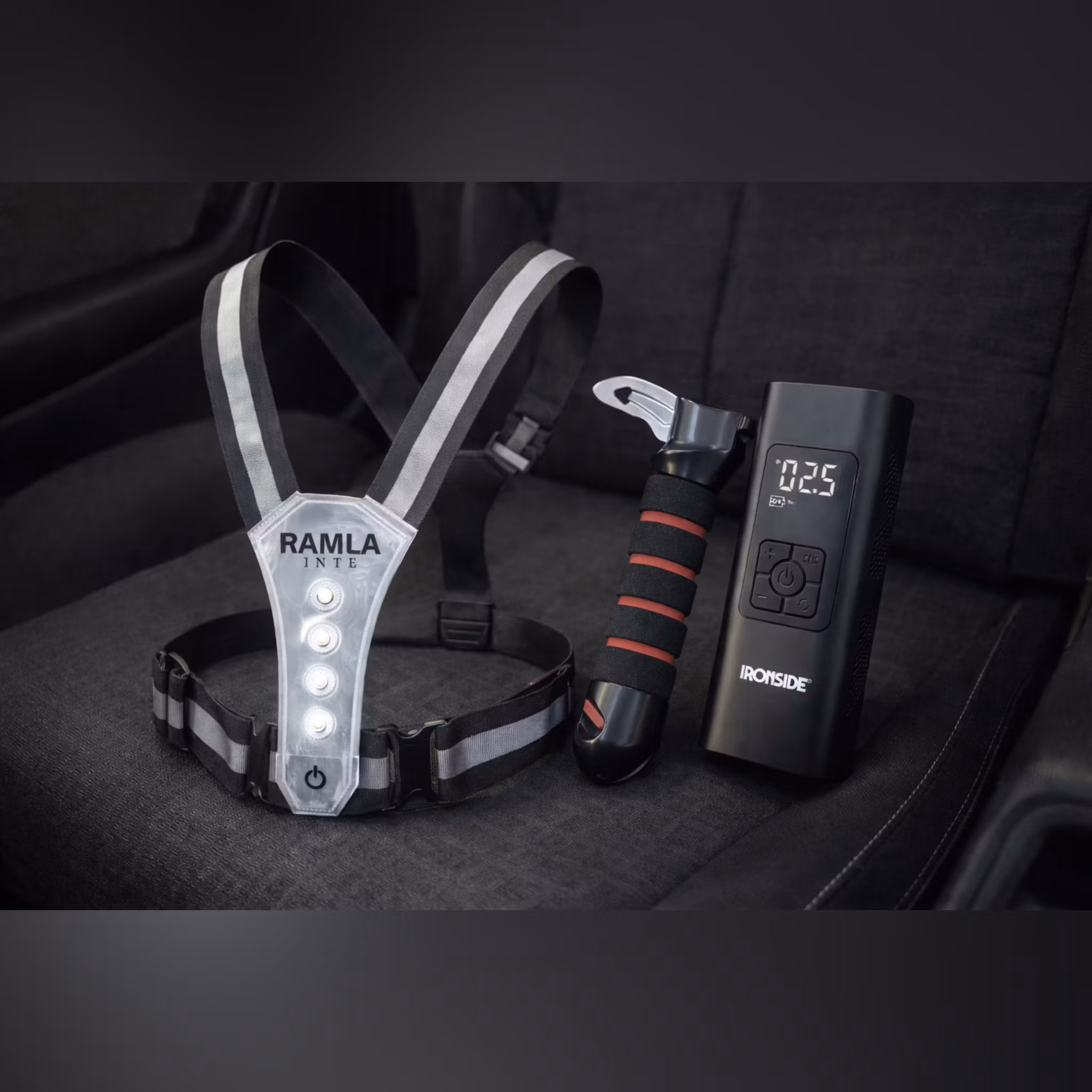 Komplett säkerhetskit för alla fordon i trafiken. Inkluderar reflexsele, minikompressor och nödhammare för ökad trygghet vid olyckor.