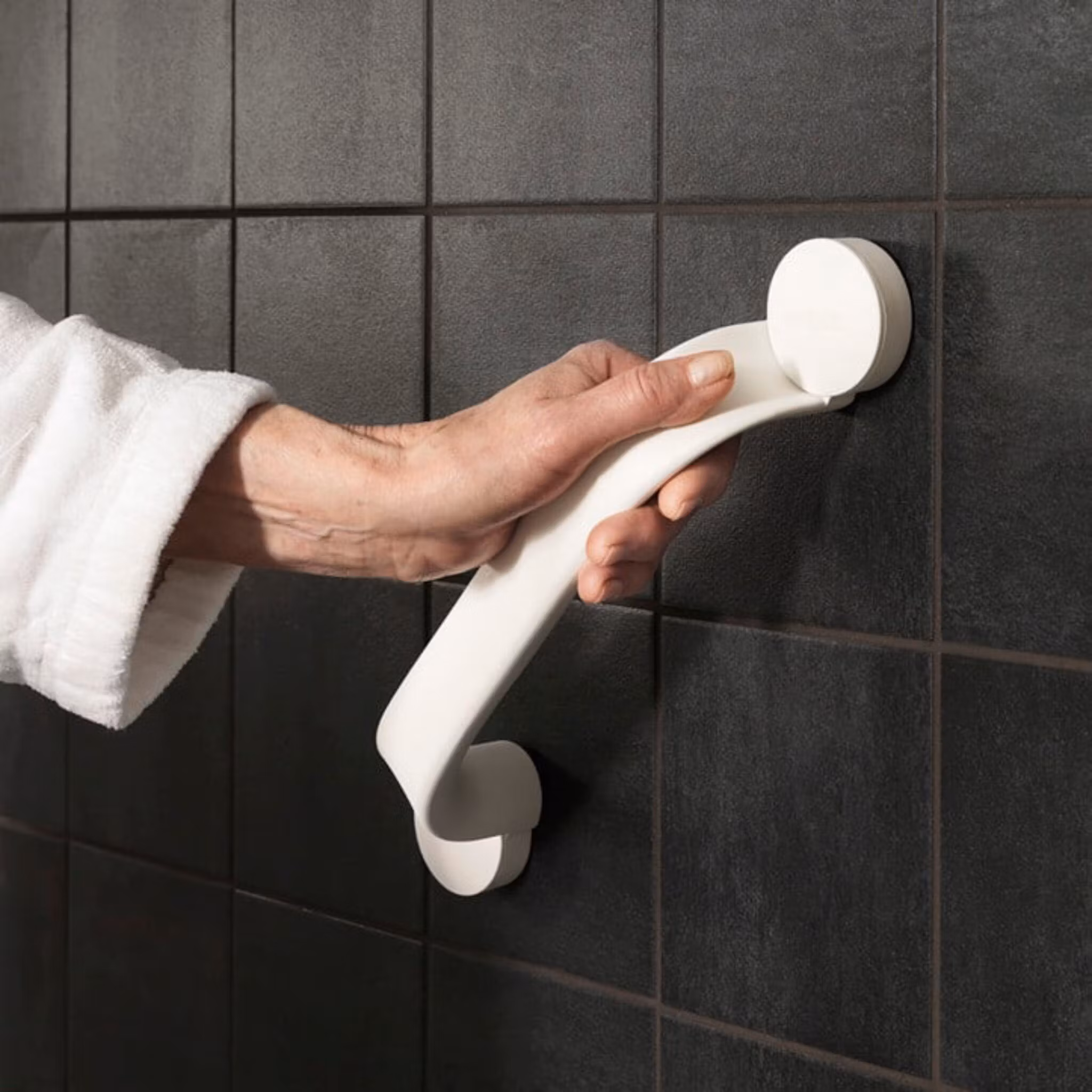 Praktiskt och stilrent stödhandtag i polypropen för dusch, badkar eller toalett. Monteras enkelt med lim, vilket gör det perfekt för känsliga ytor och hyresrätter där borrning inte är önskvärt. Den genomtänkta formen ger ett stadigt grepp även i våta miljöer.